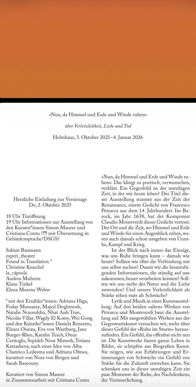 Poetry and music in an art show: This new exhibition at the Helmhaus builds on two “old” works by Petrarch and Monteverdi. The feeling works of contemporary art were selected with a view to finding out more about that feeling of calm in the eye of a storm, a that is obviously not new. The works of art capture whole lives in images, transform biographies into art. They show how the experience and memory of weakness can give rise to a sense of strength and resilience for the future. In these troubled times of ours, they gift us a few precious moments of peace, of reflection, of introspection.